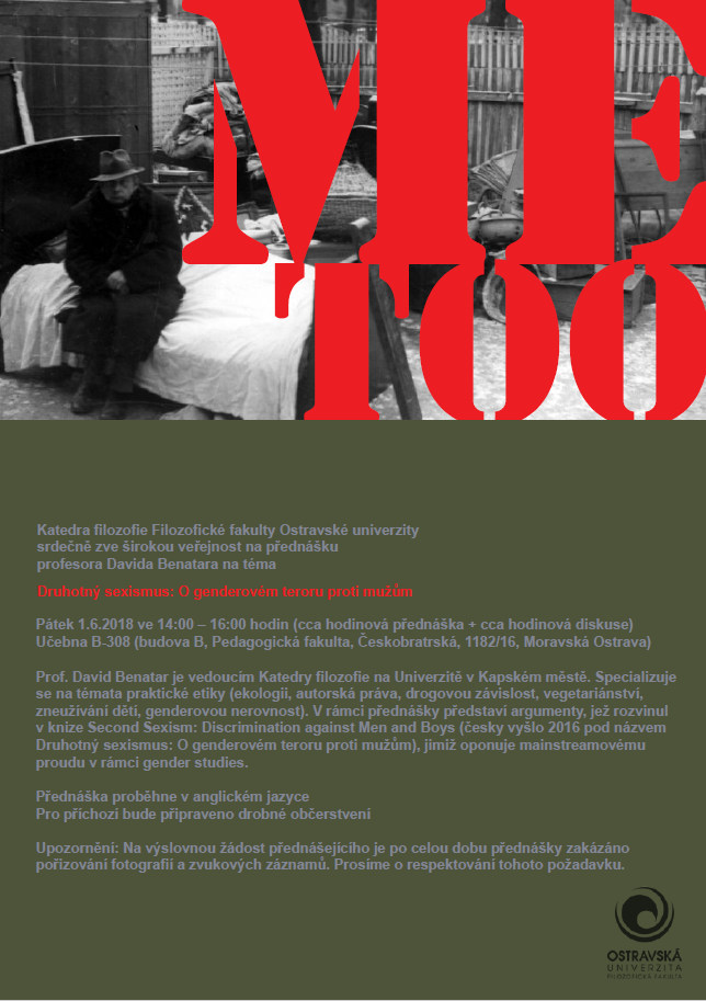 Katedra filozofie FF OU srdečně zve na přednášku jihoafrického profesora Davida Benatara o diskriminaci mužů, jež se bude konat v pátek 1. června 2018 ve 14:00 v učebně B308 v prostorách budovy B Ostravské univerzity, Českobratrská 1182/16.