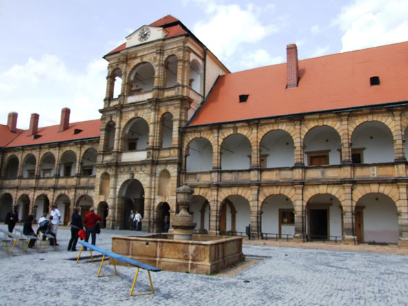 Dle ukazatele Motel Arkáda jsem poznal, že jsme na místě. Na programu byl nejdříve rozchod a poté prohlídka zámku. Zámek měl arkády po třech stranách a velice zajímavou fontánku uprostřed nádvoří. Ve chvíli našeho příchodu nad ní zrovna proháněla poštolka hejno holubů. Krásná byla také zahrada tvořená habrovými živými ploty. Trasa prohlídky vedla pouze přízemím jednoho křídla. Tam jsme se dozvěděli podstatnou informaci, že stavba je unikátní tím, že není postavena na žádných gotických základech, ale jako úplně nová...